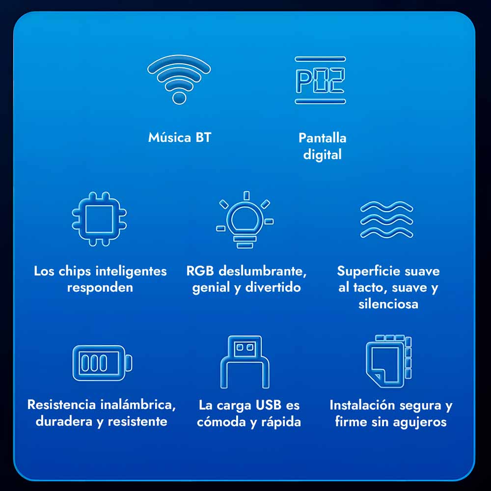 Conéctate por Bluetooth para entrenar con tu música. Los sensores cuentan golpes y las luces reaccionan, mejorando reflejos y motivación.