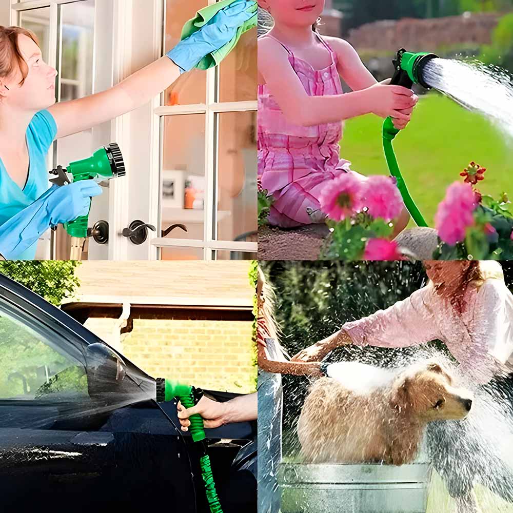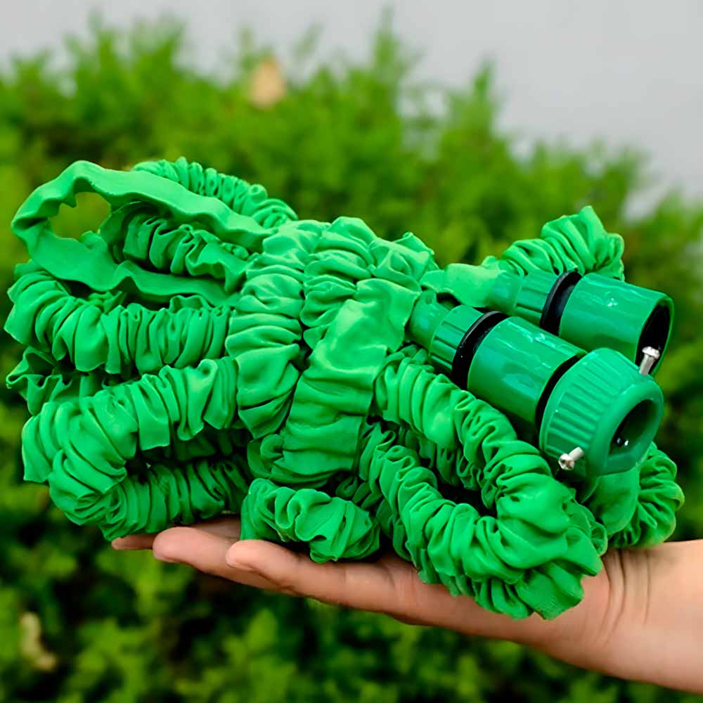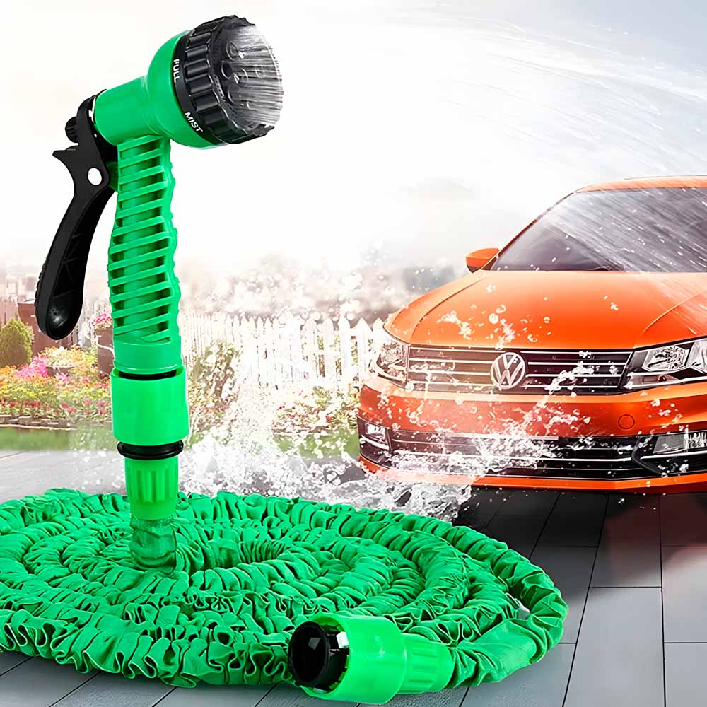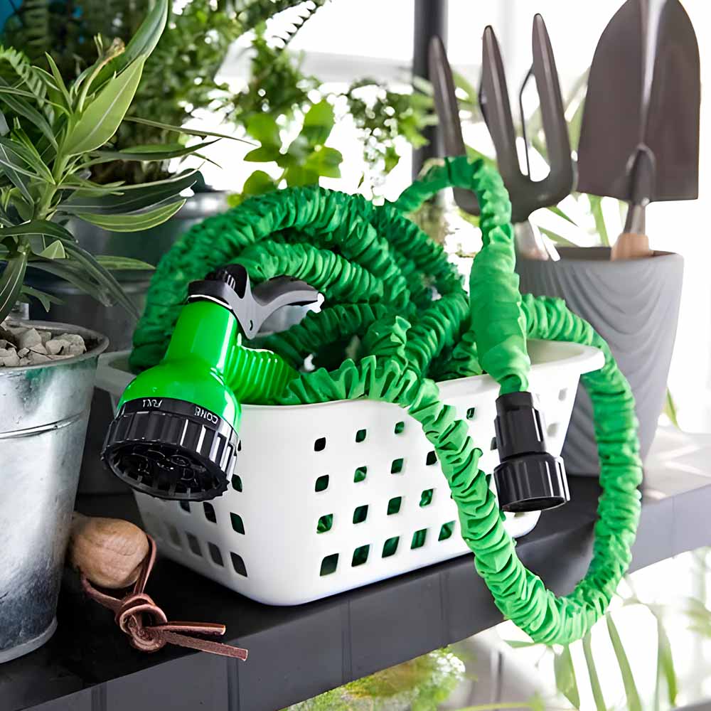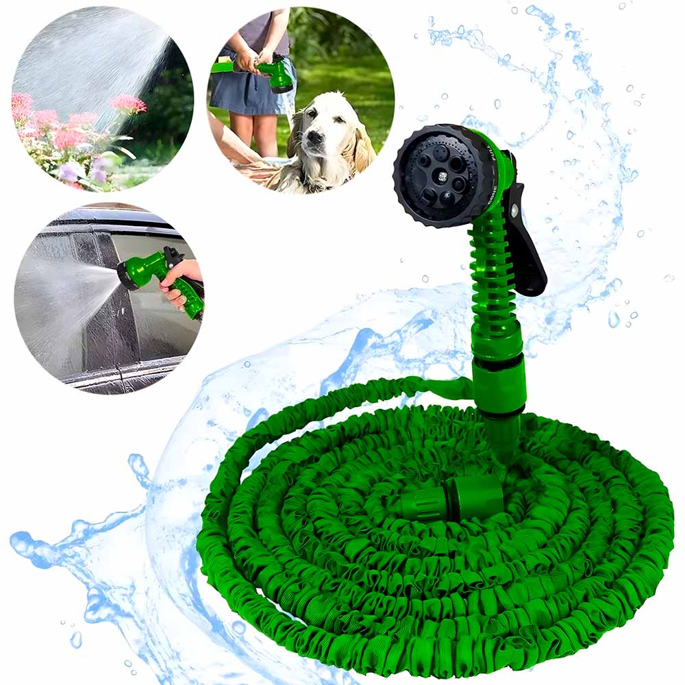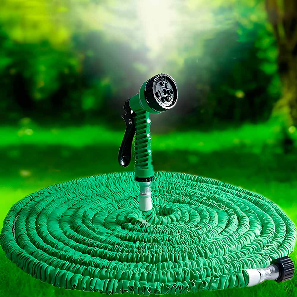 Manguera extensible y flexible que se expande automáticamente con la presión del agua y se contrae al vaciarse, evitando nudos y enredos para un uso más cómodo.