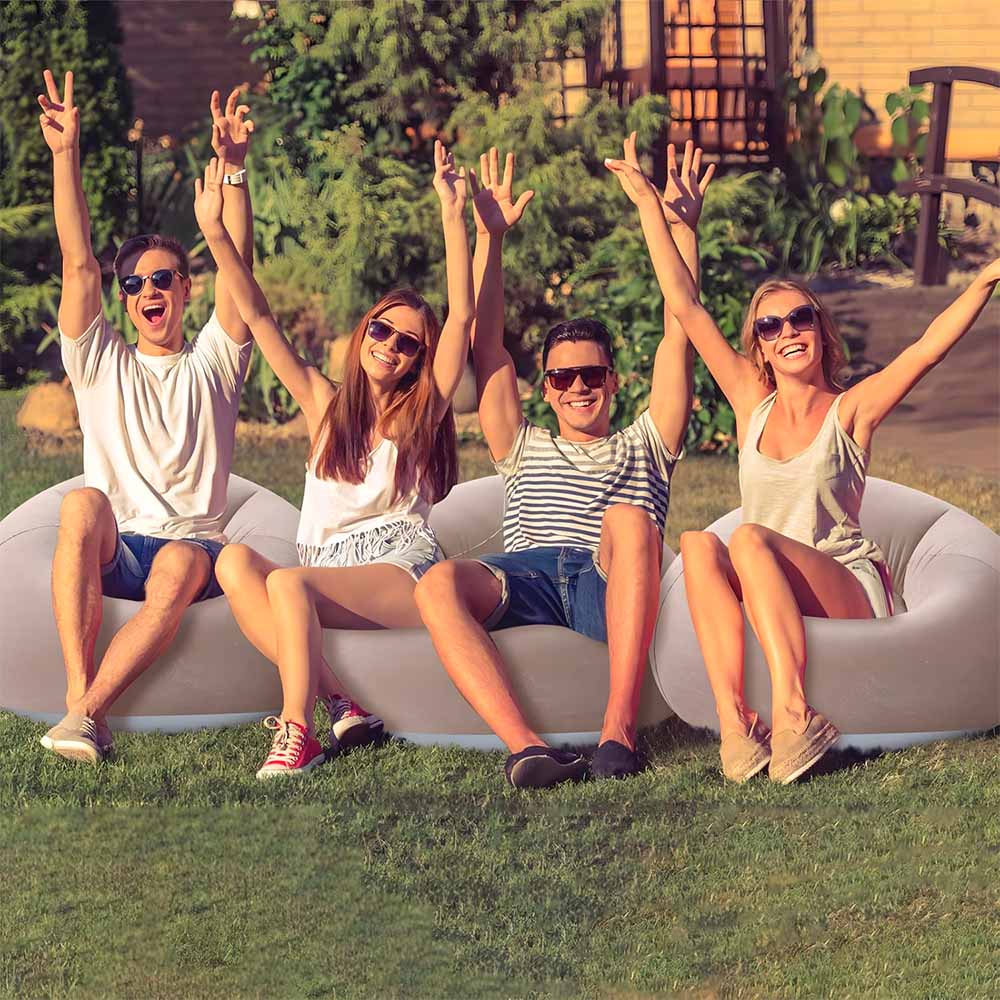 Este sofá inflable combina diseño moderno y máxima comodidad, adaptándose a cualquier ambiente. Ideal para sala, dormitorio o jardín, su material flocado y PVC de alta calidad garantiza suavidad, resistencia y durabilidad.