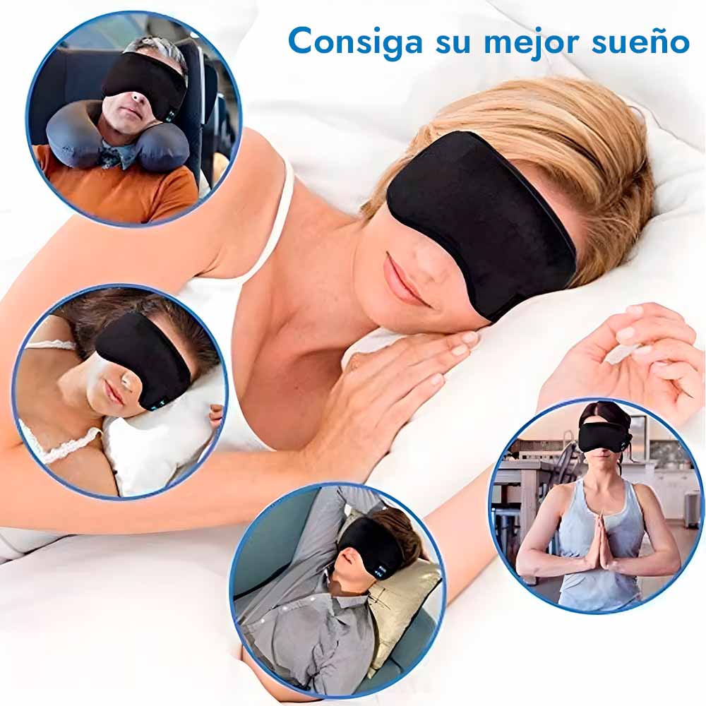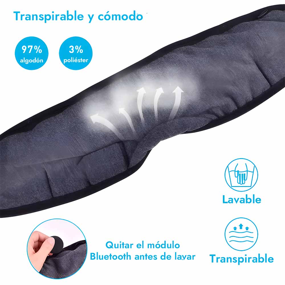 Este antifaz Bluetooth es transpirable, suave y cómodo, con una correa ajustable y lavable a máquina. Ideal para un descanso reparador.