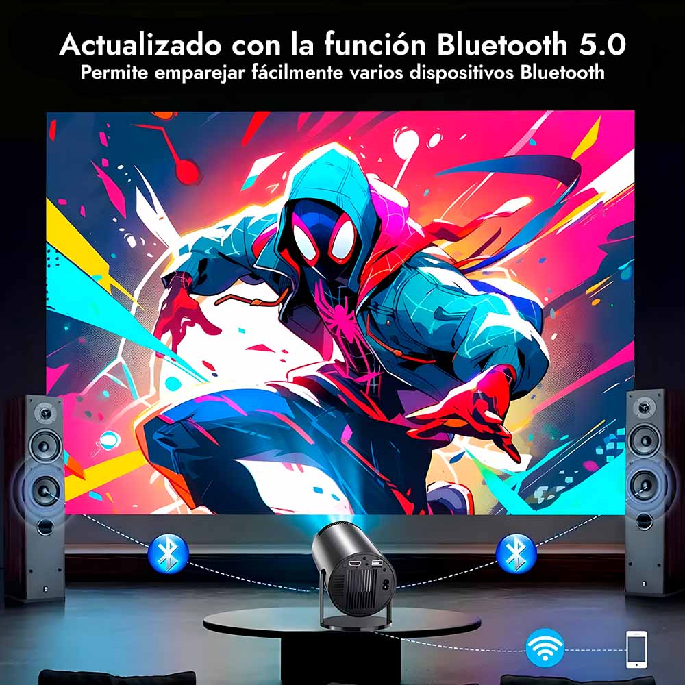 Portátil y fácil de configurar, proyecta en cualquier superficie, transformando cualquier espacio en un cine o zona de juegos.